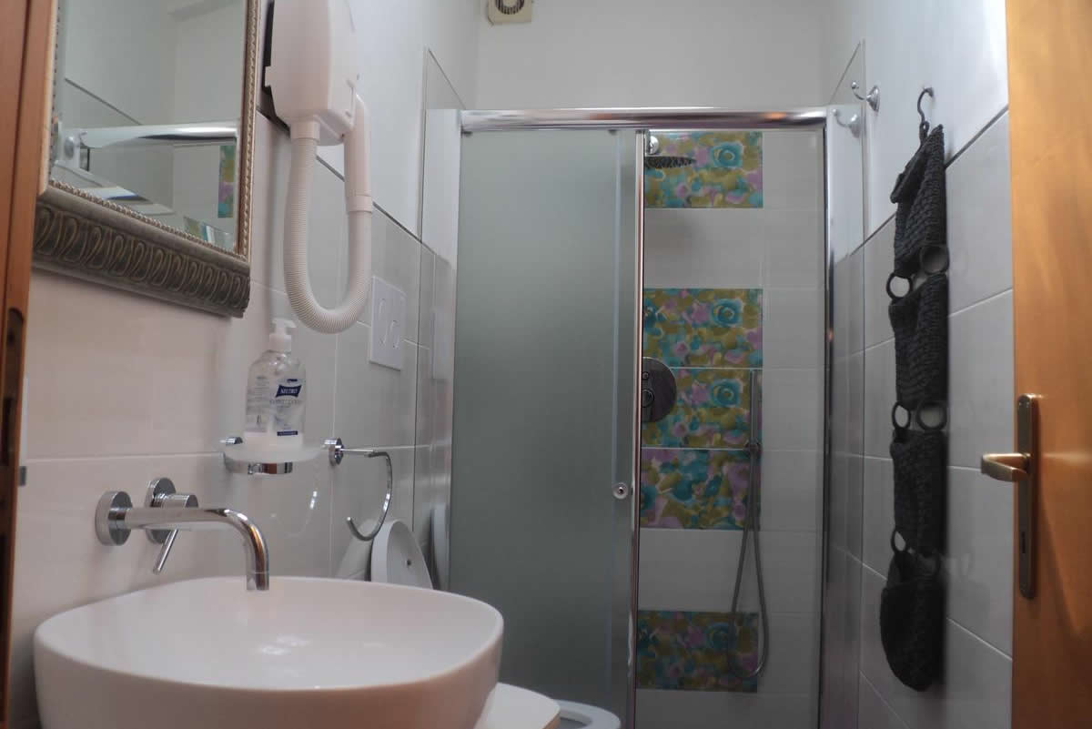 L’ampia camera è dotata di un letto matrimoniale, il bagno è attrezzato di una spaziosa doccia e di asciugacapelli a parete.